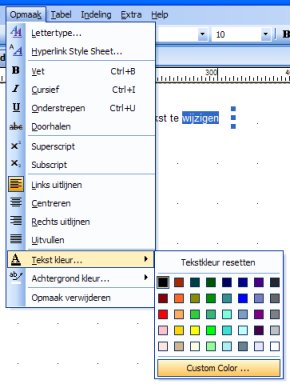 Om de opmaak van de tekst te wijzigen moet eerst de tekst gemarkeerd worden, waarna je de attributen kunt aanpassen (zoals vet, cursief, lettertype enz). M.b.v. opmaak werkbalk kunnen deze attributen worden aangepast. Tevens zijn er een groot aantal opmaak opties terug te vinden in het Opmaak menu:
