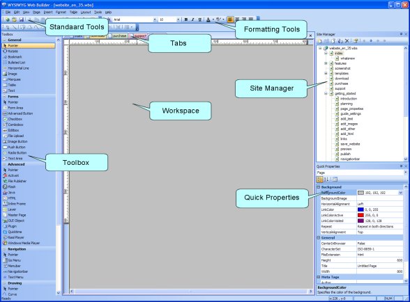 WYSIWYG Web Builder is een applicatie waarmee een volledige website kan worden gebouwd zonder eerst HTML te hoeven leren. Wanneer Web Builder wordt opgestart ziet het scherm ongeveer als volgt uit: