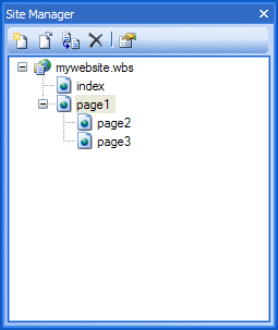 In de afbeelding hiernaast wordt een voorbeeld gegeven van een web site structuur. De bestandsnaam van dit voorbeeld is 'mywebsite.wbs', deze naam wordt altijd bovenaan de boomstructuur van de web site weergegeven. De web site kan één of meerdere pagina's bevatten en elke pagina kan ook weer subpagina's hebben.