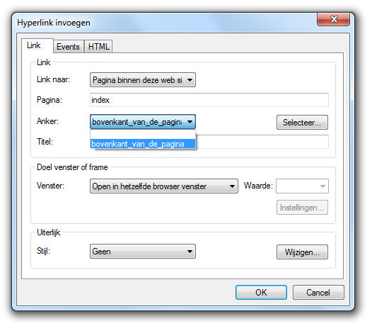 Ankers (ook wel bookmarks of bladwijzers genoemd) markeren een specifieke locatie op een pagina. M.b.v. anker kan de bezoeker van de pagina direct naar een bepaald gedeelte van de pagina springen zonder daarvoor te hoeven scrollen. U kunt het anker pictogram op iedere willekeurige plek in de pagina plaatsen, vervolgens kan dan vanuit het Link venster naar dit anker object worden verwezen. Zorg ervoor dat elk anker object binnen een pagina een unieke naam heeft.