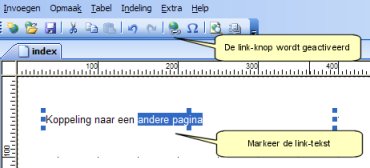 Markeer de tekst waar je de link aan wilt toekennen. Kies Invoegen->Link uit het hoofdmenu of druk CTRL+K op het toetsenbord. Het venster Link invoegen wordt nu weergeven.