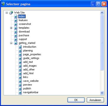 Stel de Link optie in op Pagina binnen deze web site. Klik 'Selecteer' om een pagina te selecteren. Er wordt nu een lijst van alle pagina's van de huidige web site weergeven. Selecteer één van de pagina's en er wordt automatisch een relatieve link aangemaakt (bijv ./produkten.html).