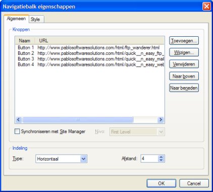 Synchroniseren met Site Manager Wanneer deze optie is geactiveerd, synchroniseerd Web Builder automatisch de knoppen via de inhoud van de Site Manager. Dus als er dan een nieuwe pagina aan de web site wordt toegevoegd, wordt er een extra knop aan de navigatiebalk toegevoegd. Ook wanneer de naam van een pagina wordt gewijzigd wordt de betreffende knop aangepast. Niveau bepaalt welk niveau van de Site Manager wordt gebruikt om de knoppen te synchroniseren. First Level De aangemaakte knoppen wordt gelinkt naar de pagina van het eerste niveau. Parent Level De aangemaakte knoppen wordt gelinkt naar de "parent" van de huidige pagina. Current Level De aangemaakte knoppen wordt gelinkt naar de pagina's van het niveau van de huidige pagina. Child Level De aangemaakte knoppen wordt gelinkt naar de sub pagina's van de huidige pagina.