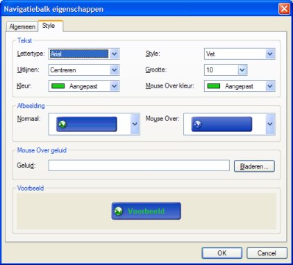 Standaard bevat Web Builder een aantal voorbeeld stylen, maar het is ook mogelijk zelf stylen toe te voegen: Kopieer de afbeeldingen van de knoppen naar deze submap: /navbar Dus wanneer Web Builder geinstalleerd is in: C:\Program Files\WYSIWYG Web Builder\ dan moeten de afbeeldingen (gif, jpg or bmp) worden gekopieerd naar C:\Program Files\WYSIWYG Web Builder\navbar