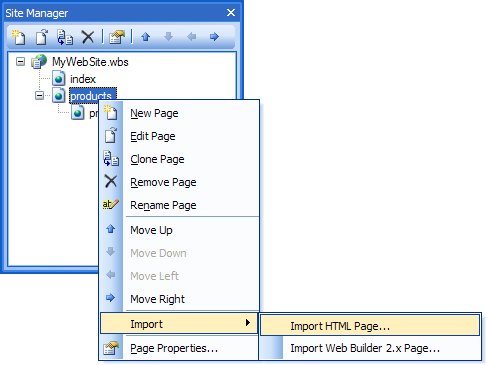 Externe HTML pagina importeren Het is ook mogelijk bestaande HTML pagina's in een website te importeren. Deze zullen (indien mogelijk) worden geconverteerd naar het interne Web Builder formaat. 1. Klik (met de rechtermuis knop) op het Site Manager venster om het context menu weer te geven. 2. Selecteer Importeren->HTML Pagina importeren... Voor meer informatie over het importeren van HTML pagina's zie ook dit artikel.